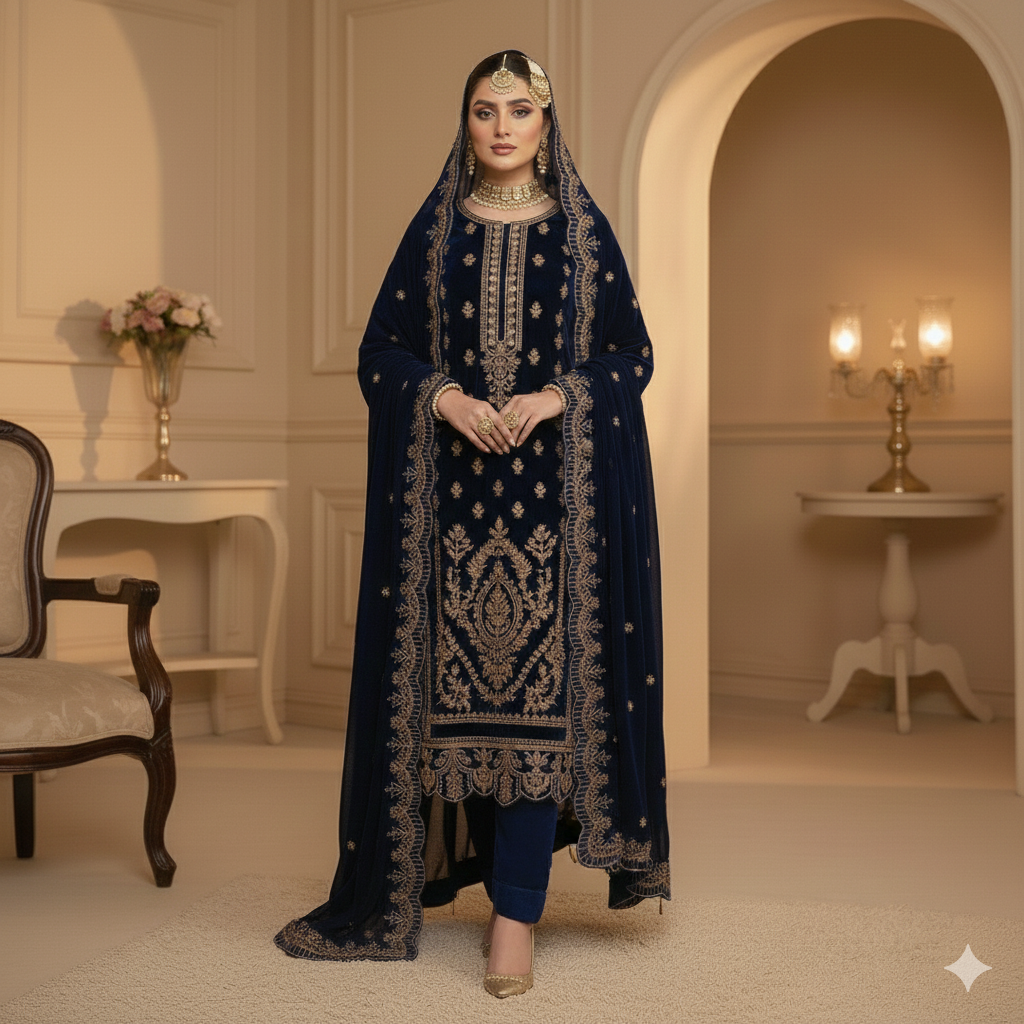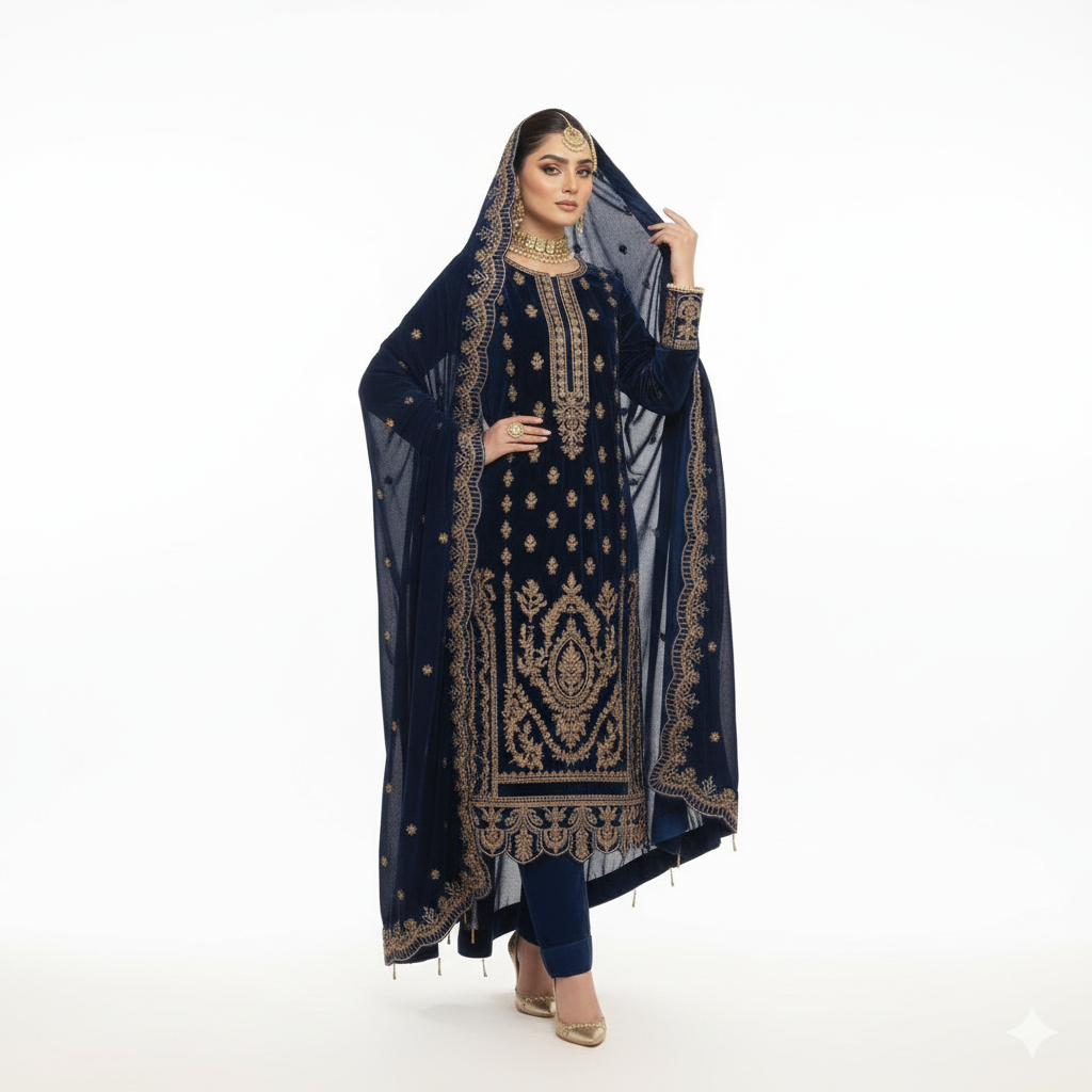 Step into elegance with this luxurious navy blue embroidered velvet suit, designed to make a bold and graceful statement. Made from premium quality velvet fabric, this outfit offers a rich, soft texture and a royal winter look.
